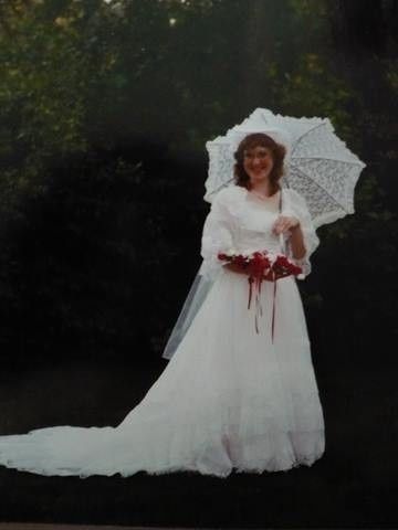 This is my mother's dress from 1990. It's been in storage for awhile but we finally pulled it out so we could do alterations. It fits almost perfectly! *phew*. The only things I need to alter are the 90s sleeves and the bizarre lace stains on the...