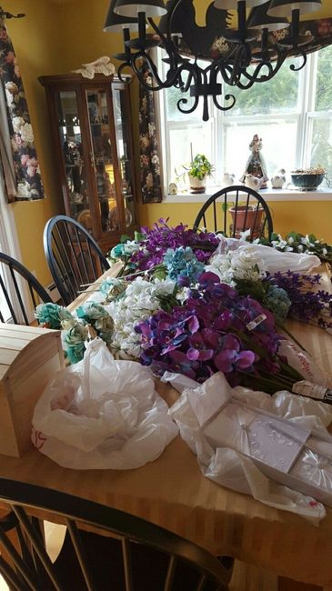 I need some help finding glassware for my centerpieces. This is everything I bought while Michaels was having 50% off floral sale last Saturday. I can buy vases at Michaels but I need at least 12. They are kind of expensive.