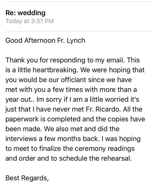 So I just got this lovely email from the priest at the church. I just want to cry. It sucks because we have met with him a few times throughout this whole process and he is the one we wanted to do this for us. I have never met the other priest. Just...