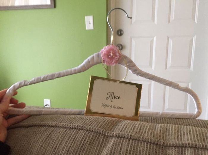 Hello everyone! I just got my craft on and decided to make hangers for my ladies. I made them out of dollar tree thin hangers, white satin ribbon and flowers from the scrapbook section at Michael's. The tags are double sided. They are table numbers....