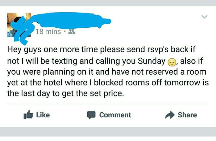 So a guy I know through some old coworkers got engaged over Thanksgiving last year. Apparently his wedding is fast approaching because this post from today is the 3rd in the last 2 weeks asking for rsvps back. I have wanted each time to comment...