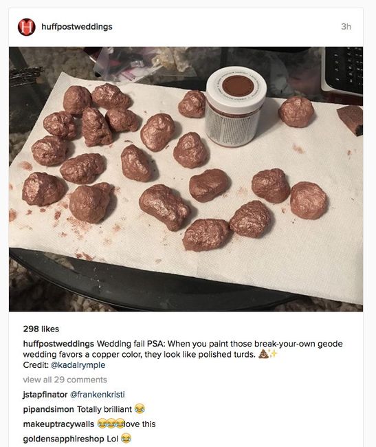 Spotted on Instagram ETA caption because these photos upload so dang small. "Wedding fail PSA: When you paint those break-your-own geode favors a copper color, they look like polished turds."
