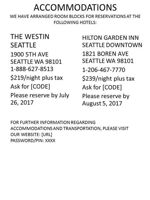 We set up room blocks at 2 hotels for OOT guests. We will be getting a shuttle for OOT family b/c we will be doing family portraits before the ceremony. Here is a draft of the text of the Accommodations Card. Is there too much information? Is there...