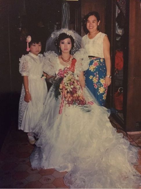 Tried you mother's wedding dress on? Just found this pic from a couple years ago when I was helping my mom move. We found her dress in the process, so I decided to try it on. She was tiny! Couldn't even zip it up all the way. Definitely not the style...