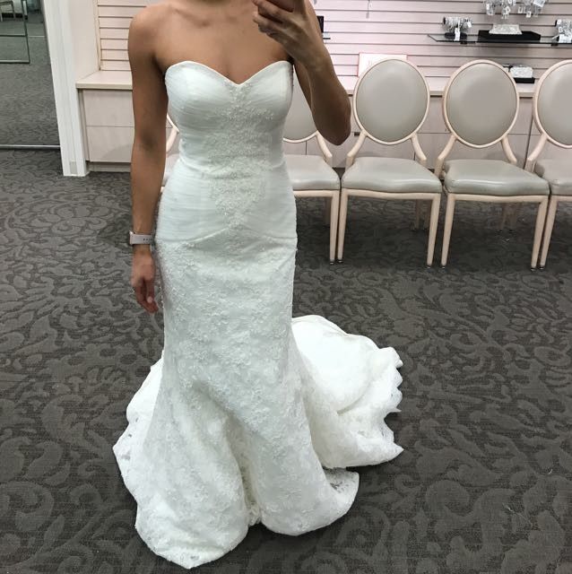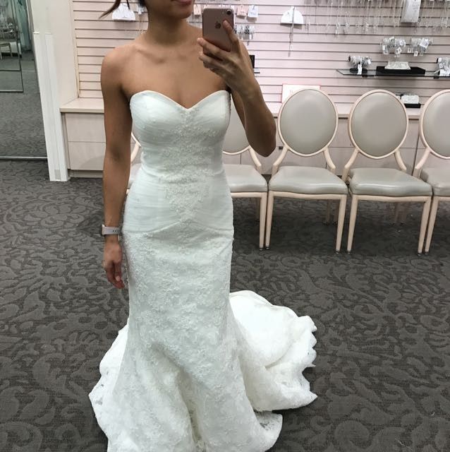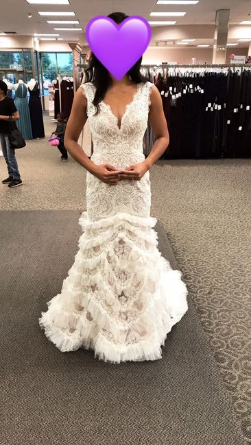Went to pick up my dress and I was so nervous that it wouldn't fit!! It fits!! Only 8 more months of staying the same size. I don't need any alterations. Just a bustle (just found out it's free!). I am forever thankful!!