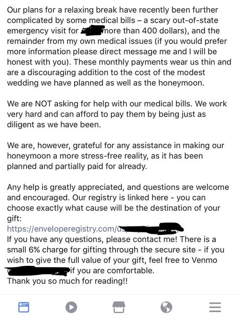 I've always seen posts on here about honeyfunds, but this actually made my jaw drop. My school has a community page where people can sell items to other students and alumni through Facebook. This was posted in the group today. I understand people...