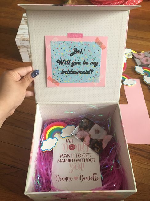 Hey everyone hope you are all having a wonderful day! Our engagement party is coming up and we are going to give our bridal party proposal boxes....just one hitch not sure what to put in them? Any suggestions are welcome! Thanks look forward to your...