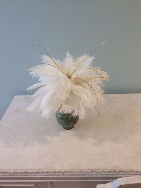 I will be having 42 tables for my reception and hoped to DIY some of the centerpieces to defray the flower bill as it adds up quickly. This is my first try at arranging ostrich feathers with gold spray. I plan on doing 12 of these for the high...