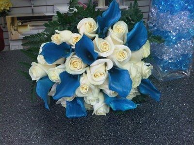 Mine hasn't been made yet, but mine will consist of sapphire colored roses, black latex calla lilies, & babies breath.