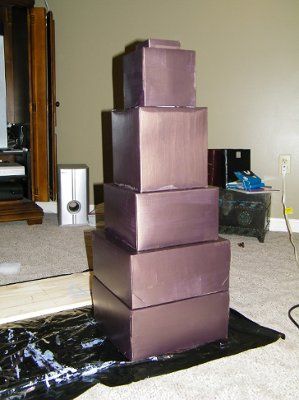opinions? the boxes are painted w a metallic paint. I think i'm going to wrap the bottom of all the boxes in ribbon (ivory color) and then a BIG diamond ring will be placed on top. what do you think?? I won't have it completed for a few more weeks....