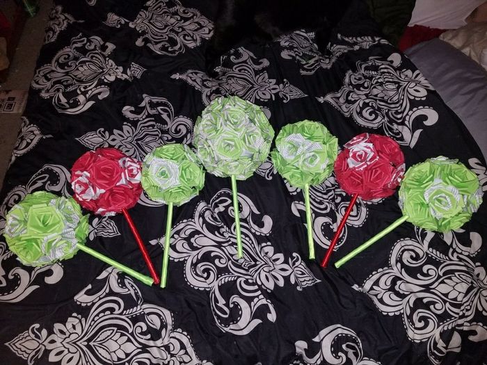 I am so happy with how they all turned out!! I am so tired but it was so worth it. The big one is the MOH bouquet. The red ones are the groomswomen bouquets! I'm so excited. When it gets closer, there's another element being added to close any gaps....