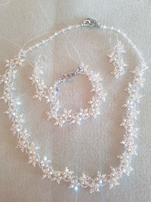 My awesome FSIL is soooooo talented at beading! She made my jewelry ensemble! She added a blue crystal to the bracelet for my something blue. What are you wearing? Show it off!