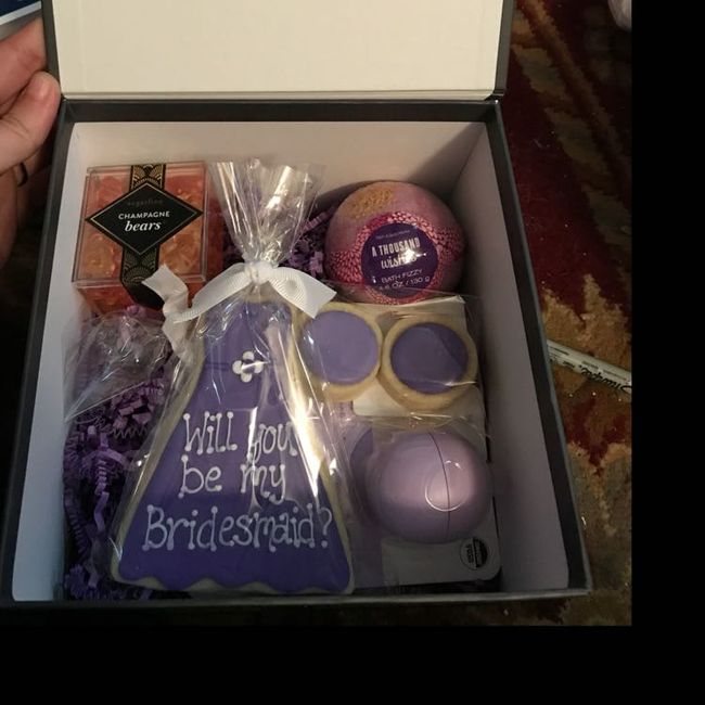 I’ve finished my bridesmaids proposals! Super cheap to do and they all loved them! I included a ring pop, a small bottle of alcohol with the wedding date on it (which I could have done better lol), a bath bomb, and some chocolate. Did you all do...