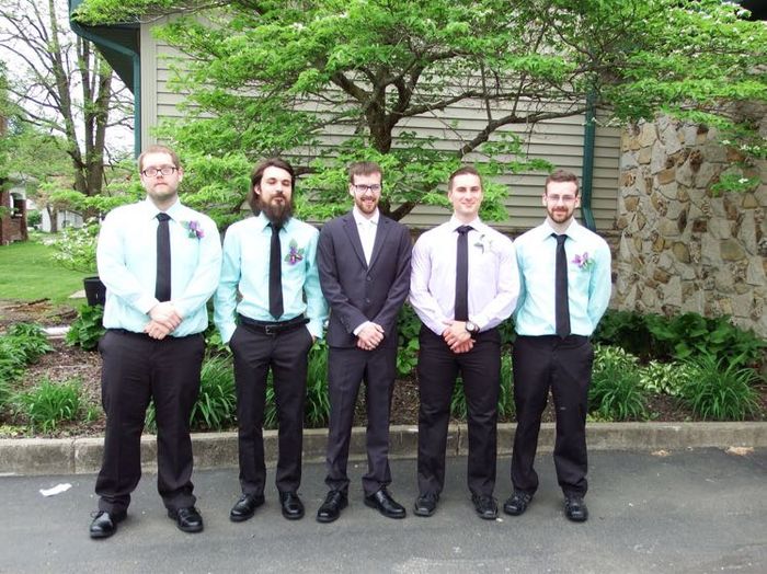 So I’m having my girls do mismatched dusty blue/light blue dresses. And the wedding will have greenery. But I’m totally stuck on groomsmen/the groom. We want it to be super cheap for them, so no suits. Probably suspenders for the groom (I don’t like...
