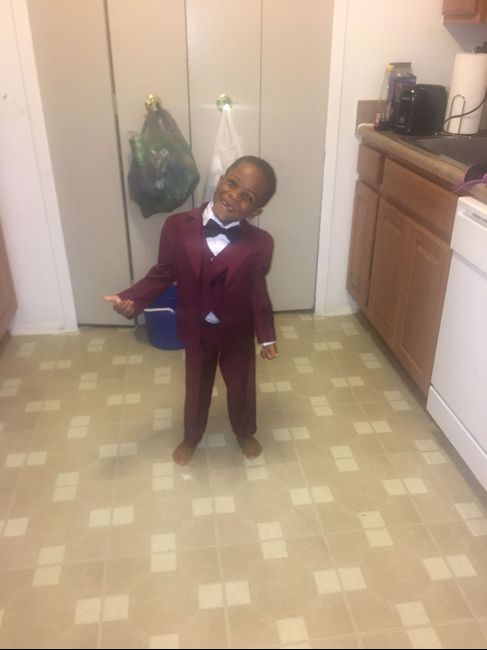 I got in my son's suit for thr wedding and he's just so cute!! Need to get the pants hemmed and order a size smaller shoe but it's perfect. **excuse the mess, going through a remodel