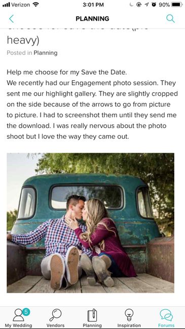 Help me choose for my Save the Date. We recently had our Engagement photo session. They sent me our highlight gallery. They are slightly cropped on the side because of the arrows to go from picture to picture. I had to screenshot them until they send...