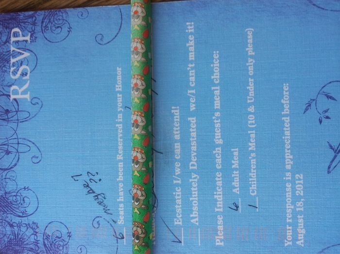 I Received this RSVP today....4 days late....... with the lovely note on top!!!! My FMIL is going to call them (its her cousin) and find out some more definitive answers for me. And in the name spot (under my AWESOME Rudolph pencil tehe) there is...