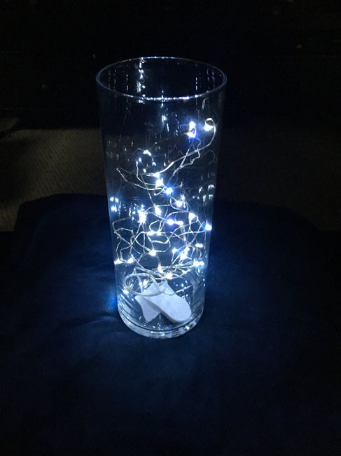 The lights for my centerpieces just came. There will be 3 vases, this is the tallest at 9 inches, then 7.5 and 6. On a blue tablecloth with white napkins.