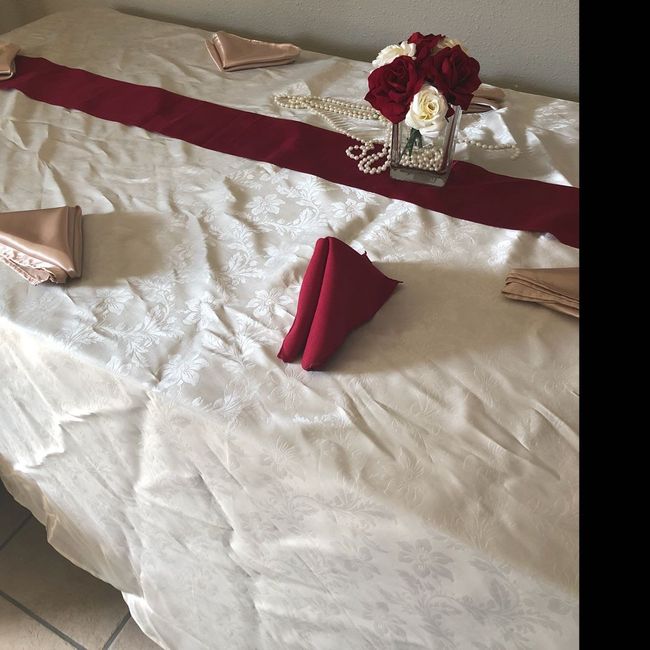 2883 days agoI have 5 months left till my wedding and I cannot for the life of me find my color in a table runner. My pictures above are the diy centerpieces and then the napkins(toupe) satin and ivory satin tableclothes. I wanted a deep red runner but when i got...