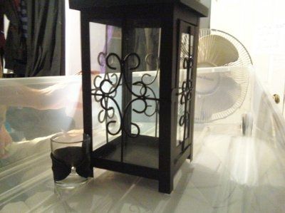 These are our centerpieces. Pardon the horrible 'we put this together at Hobby Lobby' picture, it's the only one I have it mostly together. The glass in the lantern will be frosted and the 4 votive holders will have ribbon around them, 2 black and 2...