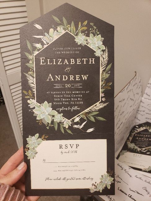 Future hubs picked our invites and I gotta say, he did a very good job. I love them. I wanted a seal and send style and I'm really happy he was on board with that. I left the rest to him. I love that the RSVP rips off and sends back past card style. ...