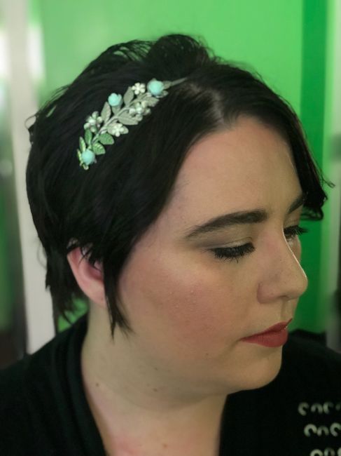 I have my dress but am undecided about my head attire. Should I do a veil or headband. I am worried a view with my long sleeve dress may look like too much. I also don't know if my short hair will work with a veil. I'll attach pictures of my dress,...