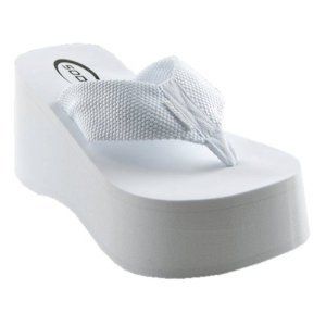 I am having a beach wedding and want the bridesmaids to wear flip flops. The picture shows the type that I want (platform between 2 1/2-3"). I want these in hot pink or black. Here come the problem. One of my bridesmaids wears a size 12! I am finding...