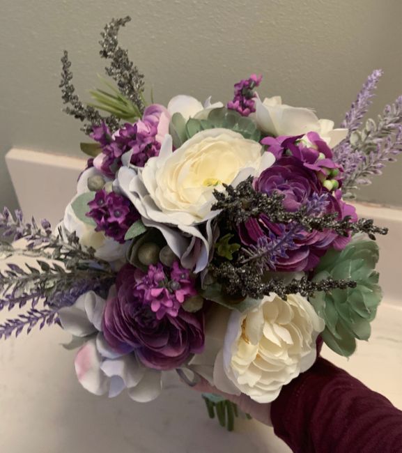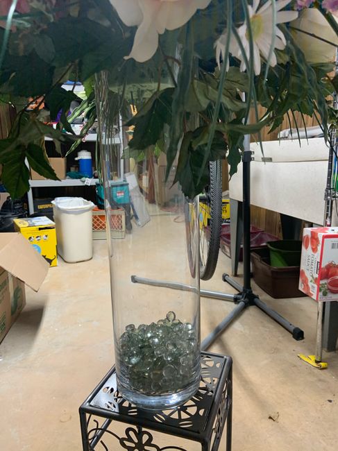 Hi! Finished making my floral arrangements for the beginning of the ceremony aisle and at the altar. Shades of purples, ivory, and white. The vases will be on metal stands. I thought I had tons of glass stones but when I separated them between four...