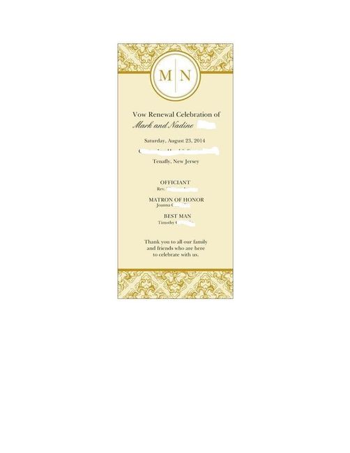 We're having a super quick ceremony to renew our vows and exchange new rings and that's it. Our BP is only made up of a BM and MOH, no bridesmaids, flower girls or groomsmen. I still wanted to have a program for guests to have when they come in and...