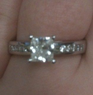 Mine is princess cut with 14 accent diamonds in the setting. Total carat weight is .75 I love that it's simple and classic, yet elegant at the same time! It's perfect for me! Show everyone yours!
