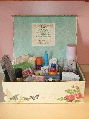I have seen this on here before but can't seem to find the list I made. I want to put baskets in the bathrooms but I feel like I am missing some stuff.I have in them...... small sawing kit nail file q-tips cotton balls shoe polish clear nail...