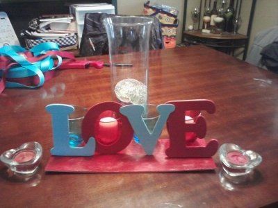 Here is my project I worked on today. Still not finished, the letters are going to be glued to the board instead of up against the votives. The votives will not be there at at all, (maybe). The vase is where my bouquest will go after ceremony....