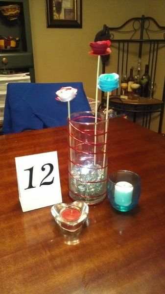 I am finally getting my centerpieces to the way I like them... only problem now is I have 2 weeks to finish 18 of them. Anyone feel like making some roses? LOL. What do you all think?