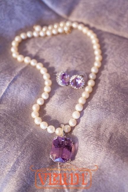 There's rhinestone detail on the draped front (close up attached) as well as on the flowers on the side. Can I wear a simple strand of pearls or should I stick to rhinestones? Any examples you could show me? btw, that green color in the second pic is...