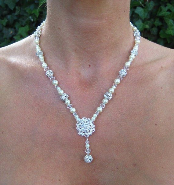 There's rhinestone detail on the draped front (close up attached) as well as on the flowers on the side. Can I wear a simple strand of pearls or should I stick to rhinestones? Any examples you could show me? btw, that green color in the second pic is...