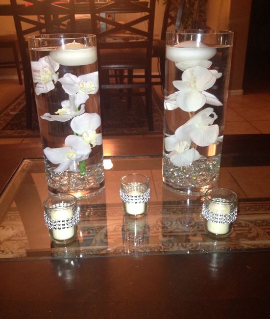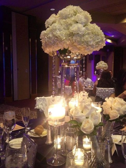 I was originally wanting purple and white centerpieces, but my mom likes all white flowers. Mom says the white flowers would pop with our purple uplighting. My Fiance isn't any help and I can't decide white one I really like. I think I really like...