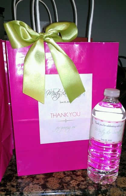 ...and they're not even done yet! I'm putting a water bottle with a custom label, a Mike's hard lemonade in Strawberry or Lime (my wedding colors are hot pink and lime green!), a bag of nuts, a couple ghiradelli chocolates, a pkg of keebler sandwich...