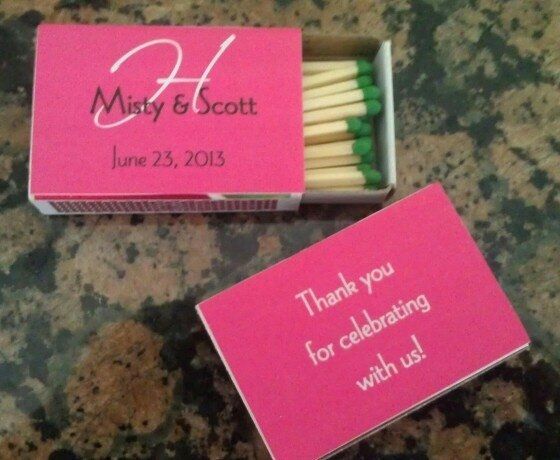 So few people at our wedding are smokers, so I did not want to shell out $25 for custom matchbooks. I picked up a pack of 10 match boxes for $.99 at the grocey store. I think they came out pretty cute!