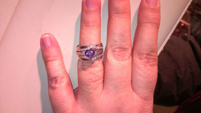 We bought my e-ring (amethyst heart shaped, I fell in love with it). At the same time we bought the "enhancer" that was to serve as my wedding ring. I am a rather fluffy gal and the rings did not fit off the rack. They were sent out to be sized. They...