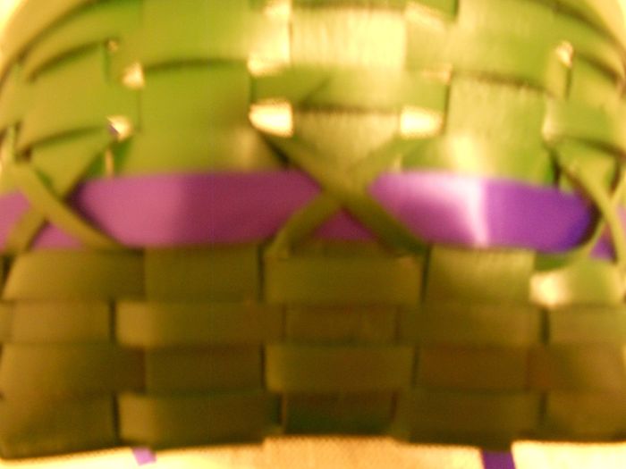 So this basket started life as a cheap pink easter basket. We used spray paint to change the color (thanks DH) and then I beribboned it. First picture is the basket setting on our unmade bed. The second is me holding it to show the ribbon streamers...