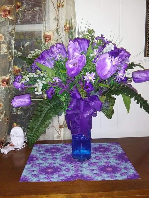 Hey everyone, Sharing another finished arrangement. This one will serve double duty, and start out at the wedding, then move to the reception. This was a tall, clear vase given to me by a friend. I put tulle and flower petals inside, then wrapped the...