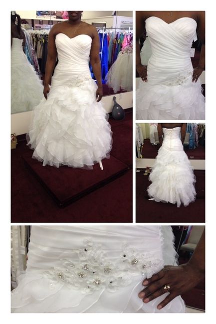 Here is mine It's a Tara Keely I purchased at Kleinfeld's last May! I cannot wait to wear it on the big day! I plan to add lace sleeves and have a key hole opening in the back! Show me your gowns!