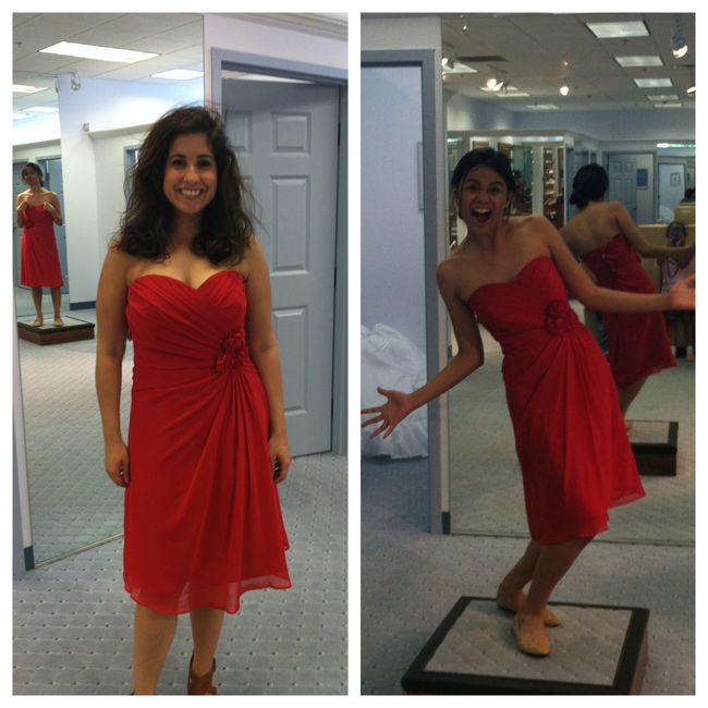 Just wanted to share pictures of my bridesmaids dress. Went with my sister to pick hers up today. When we ordered they only had the long version in a burgundy color to try on in-store so today was the first time seeing the actual cut and color paired...