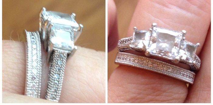 My E-ring is white gold with a .76 ct round diamond with 14 small diamonds up along the side. My wedding band matches my E-ring with small diamonds running along the entire front. In case people are wondering what those little metal things are on the...