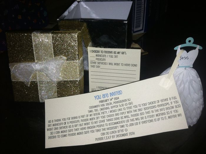 I'm paying for my BMs to get a mani or pedi for te wedding, but since well be going valentines day morning alot of places may be booked so I am sending out these invites to them asking which service they want and if they plan to get anything else...