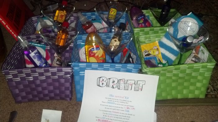 I made these "survival kits" for my BMs! I will be adding some nice tissue paper Inside to bring up the items but they each come with a survival poem, Martini glass 1 shot (some vodka some tequilla) Soft slippers Lip gloss Eye shadow Some type of...