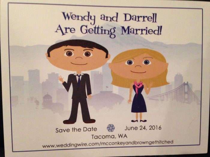 Ordered them from Etsy. We never took engagement pictures so I thought something like this would be fun. The background is the Tacoma skyline; Mt Rainier, the Tacoma Dome, and bridge.