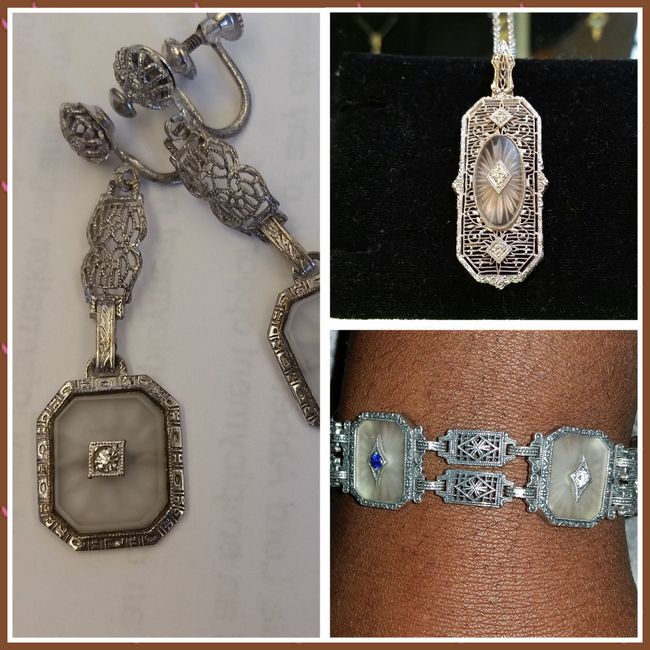 So excited about my jewelry - 1920's filigree and camphor glass. The pieces were hard to find but at long last I finally found some earrings. They need to be cleaned but couldn't wait to post.