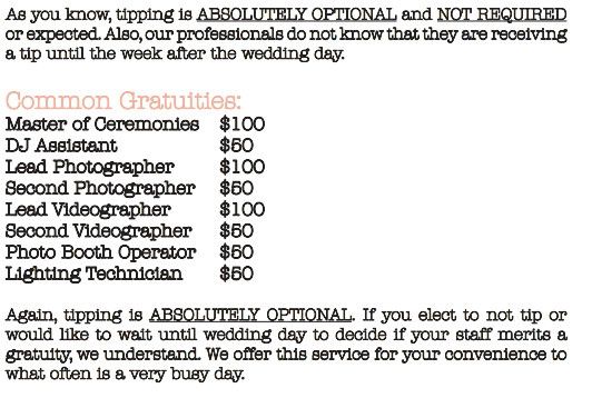 Any advice for how much to tip vendors such as the DJ, photographer, and Officiant? My photographer owns his company and I've read you don't tip if that is the case...it feels weird not to tip him though. The Officiant is non-denominational and we...