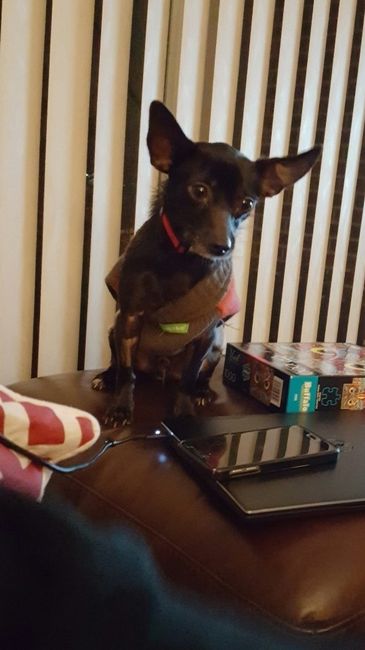 Snuggling on the couch with pup tonight drinking wine since DH doesn't come from his work trip until tomorrow. I moved the slightest bit and she Weasled herself into my spot and stole the pillow. She loves watching tv-especially if there is animals...